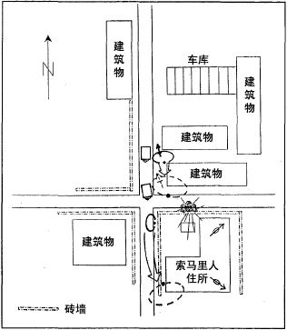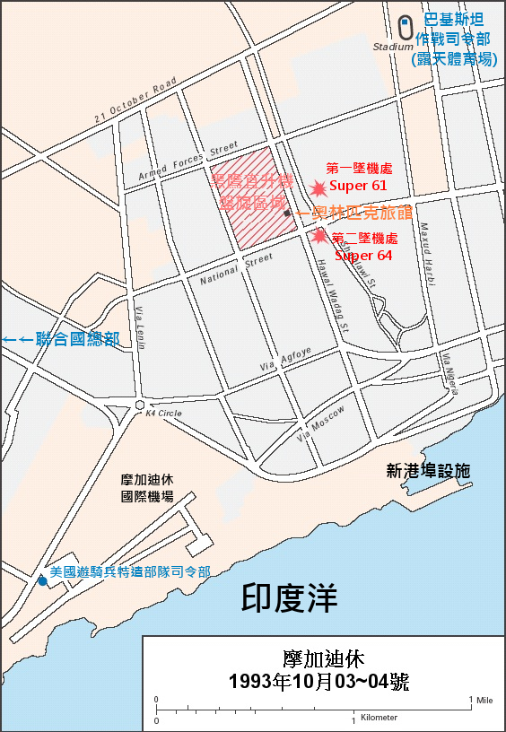 圖1,摩加迪沙地圖和A連2排的行進路線