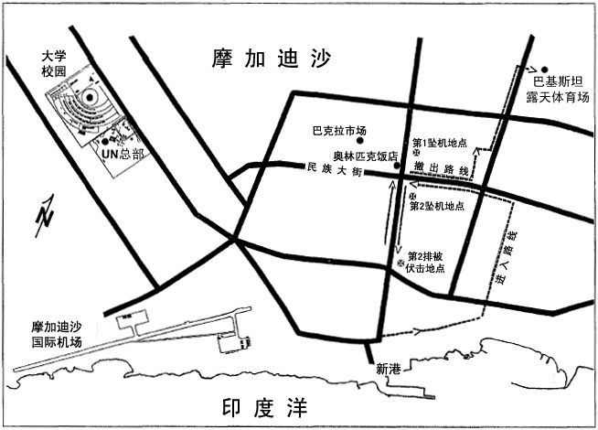 我們乘坐的兩輛裝甲輸送車沿民族大街向西繼續行駛,然後向南朝第2墜機地點並越過它繼續前進,我相信,這是在試圖返回新港埠設施。