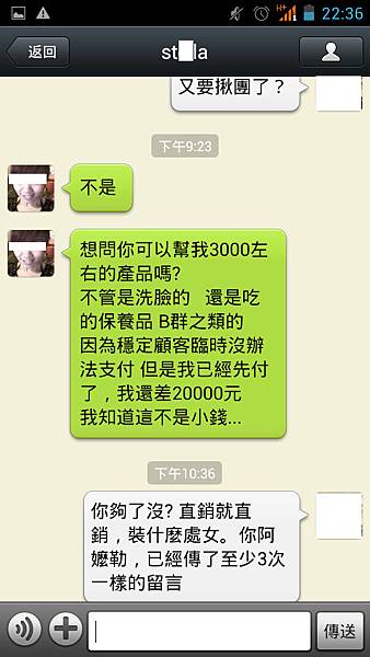 2013年中開始玩交友App,遇到這個女生,開頭很正常,不過她說她是彰化人,因為距離的關係就沒再密她,過了幾個禮拜後她主動密我就是類似的直銷產品,騙說什麼被朋友託買東西被放鴿子,欠了好幾千塊的貨款,她很難過不知道怎麼辦於是找上我?幹你娘我幫你付這筆錢能幹到你嗎?莫名其妙找上一個只聊不到1個小時的網友,講白一點類似詐騙集團,利用美色騙取男性網友的金錢。我看我下次問賣她的鮑魚好了?